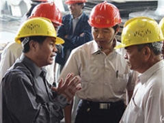 董事长总经理王家安(右一)陪同孟加拉雅戈水泥厂领导考察公司生产现场。